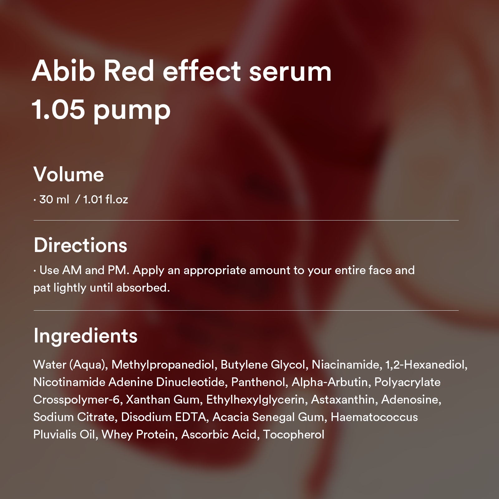 Red effect serum 1.05 pump:Water, Methylpropanediol, Butylene Glycol, Niacinamide, 1,2-Hexanediol, Nicotinamide Adenine Dinucleotide, Panthenol, Alpha-Arbutin, Polyacrylate Crosspolymer-6, Xanthan Gum, Ethylhexylglycerin, Astaxanthin, Adenosine, Sodium Citrate, Disodium EDTA, Acacia Senegal Gum, Haematococcus Pluvialis Oil, Whey Protein, Ascorbic Acid, Tocopherol: